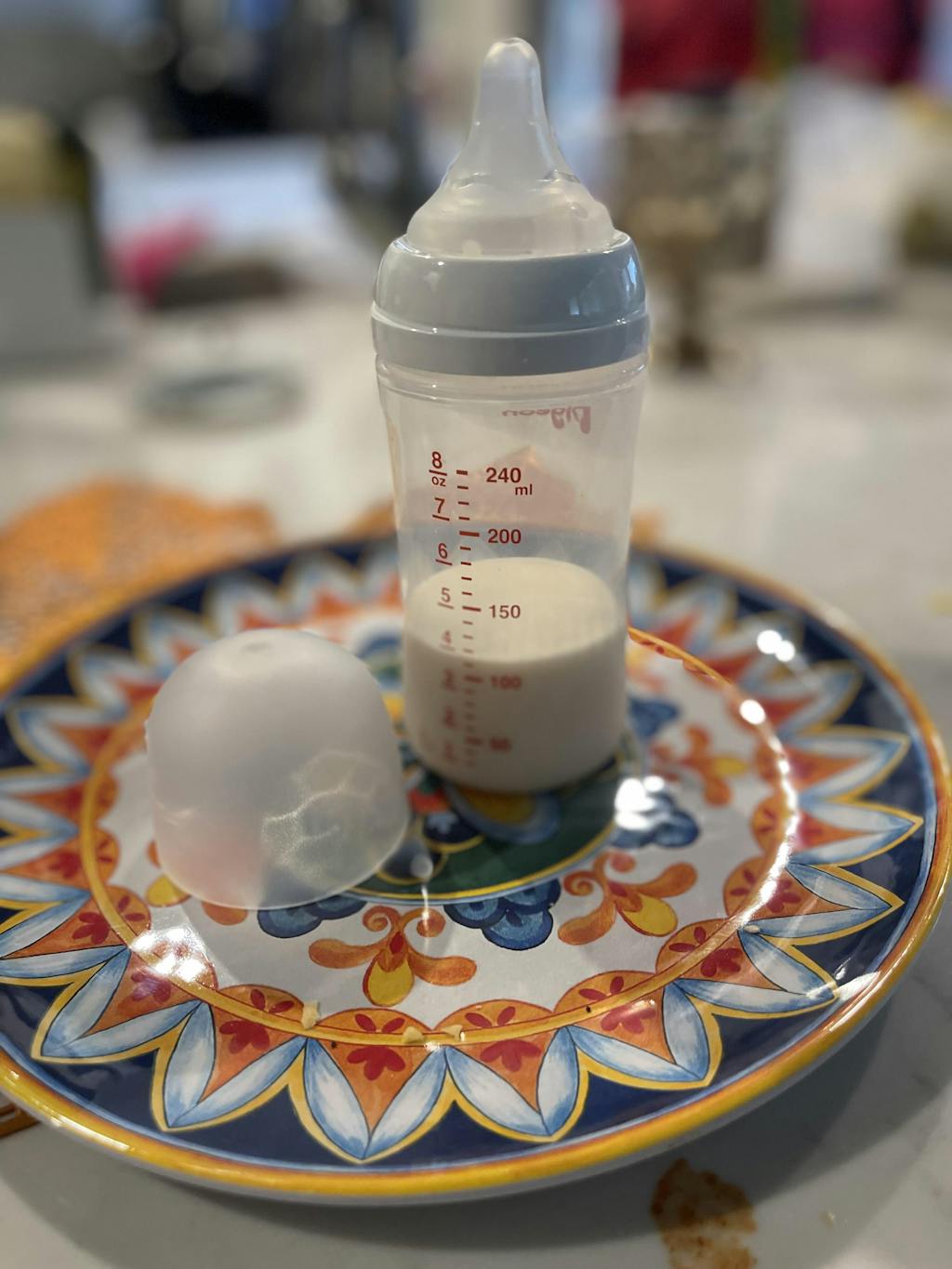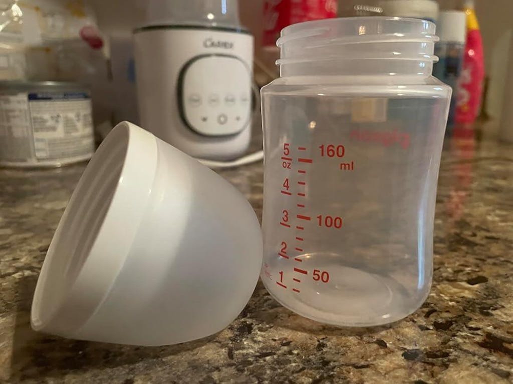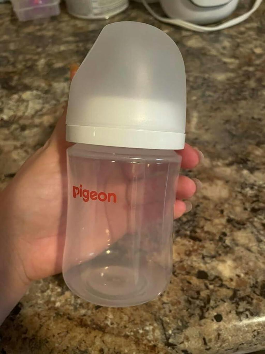 The shape of the teapot offers a latch almost equal to the latch on the breast. I like that the lid has a flat part that allows you to support it without the teapot touching the surface when you have to open the bottle. My daughter uses the bottle once a day and has had no confusion with her breast latch.